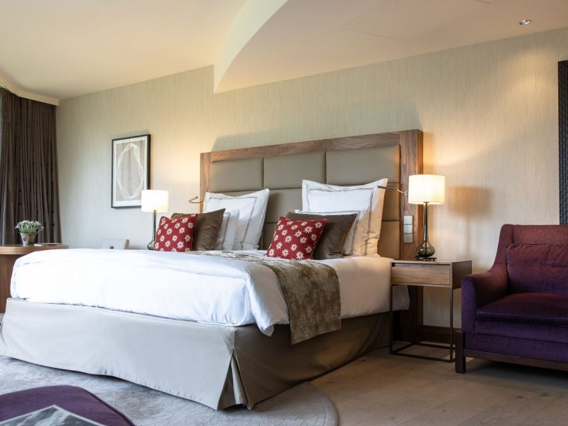 Unsere Präsidenten Suite erstreckt sich über stolze 160m² und besticht durch luxuriöse alpenländische Behaglichkeit, harmonisch mit kosmopolitischem Design und Schweizer Flair. Hinter einer Flügeltür aus dunklem Holz liegt der ovale Mittelpunkt der Suite, das lichtdurchflutete, repräsentative Foyer. Das hervorragend ausgestattete und geräumige Wohnzimmer mit elektrischem Kamin, der elegante Arbeitsbereich und ein separates Esszimmer für bis zu 8 Personen machen die Suite (die während des Weltwirtschaftsforums auch von der globalen Elite gewählt wird) zum idealen Treffpunkt für private oder formelle Zusammenkünfte. Das prächtige Schlafzimmer ist mit modernster Technik ausgestattet und verfügt über einen begehbaren Kleiderschrank. Das angrenzende Badezimmer bietet mit der großen freistehenden Badewanne, der Privatsauna, der Regendusche und dem in die Wand integrierten Fernsehbildschirm Luxus pur. Die riesige Terrasse umgibt die gesamte Suite und eröffnet fantastische Ausblicke über Davos, auf die Alpen und den nahe gelegenen Davosersee. Die Suite ist für die Unterbringung von bis zu 6 Personen geeignet, kann jedoch durch den Anschluss von zwei direkt angrenzenden Doppelzimmern noch erweitert werden.